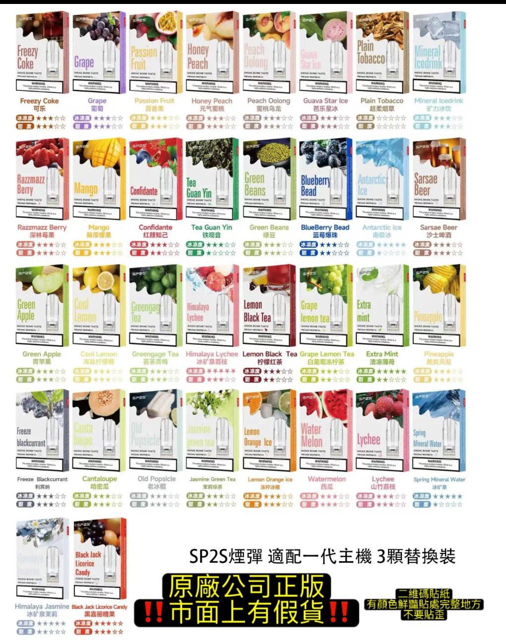 | 原廠SP2彈一盒3顆 | 可樂, 葡萄, 百香果, 元氣蜜桃, 芭樂, 菸草, 寶礦力, 莓果, 芒果, 紅顏知己, 鐵觀音, 綠豆, 藍莓, 沙士, 南極冰, 青蘋果, 檸檬海鹽, 青梅, 冰礦荔枝, 檸檬紅茶, 薄荷, 鳳梨, 俐賓納, 哈密瓜, 老兵棍, 茉莉綠茶, 凍檸橙冰, 西瓜, 山竹荔枝, 冰礦泉, 冰礦茉莉, 黑加侖糖果, 批發私克服 |